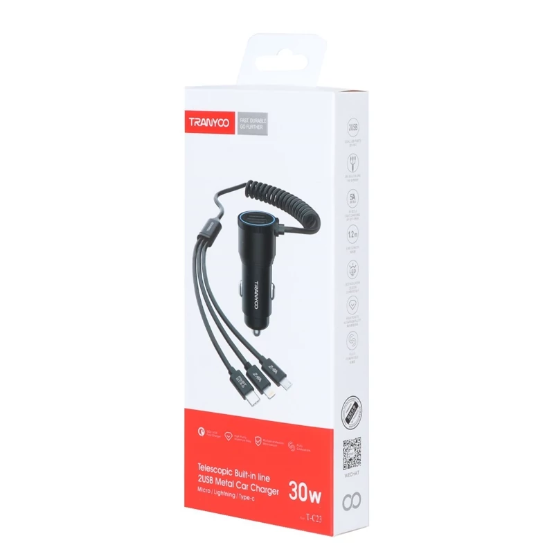 شارژر فندکی فست دو پورت Tranyoo مدل T-C23 30W بهمراه کابل متصل - مشکی