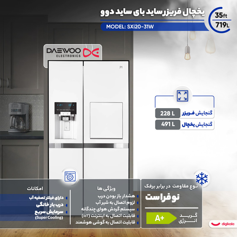 ویژگیهای یخچال فریزر : هشدار باز بودن درب , لزوم اتصال به شیر آب , سیستم گردش هوای چندگانه , قابلیت اتصال به اینترنت (IoT) , قابلیت اتصال به گوشی هوشمند
