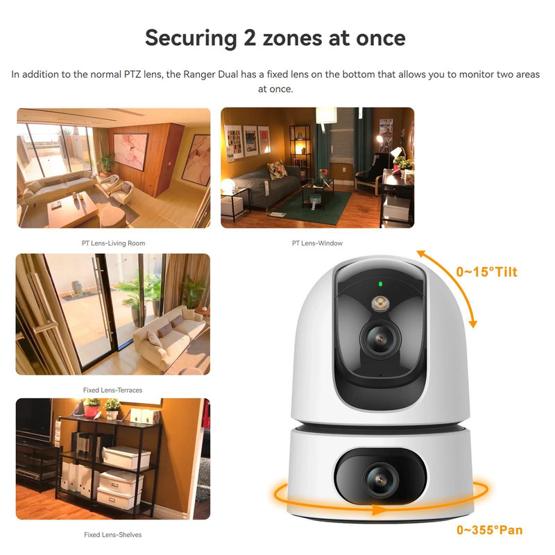 دوربین بیسیم گردان آیمو Ranger Dual با داشتن دو لنز و قابلیت ضبط تصاویر به صورت همزمان با استفاده از این دو لنز، یک دوربین خاص به شمار میرود. یکی از این لنز ها ثابت و دیگری گردان است و وجود این دو لنز در یک دوربین باعث میشود کمترین نقطه کور در این دوربین وجود داشته باشد و هر تهدید یا سوژه ای به راحتی در دو قاب تصویر دوربین قرار بگیرد. این دوربین دارای تکنولوژی های تشخیص انسان، صدای دوطرفه، تشخیص حرکت، ارسال هشدار هوشمند و دید در شب میباشد.