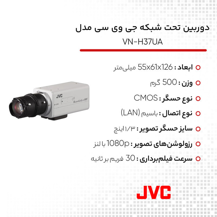 دوربین VN-H37U یک محصول حرفه ای برای نظارت روی محیط است که از طریق درگاه LAN وارد شبکه میشود. این دوربین توسط شرکت جی وی سی روانه بازار شده و به یاری بهره استفاده از حسگر CMOS میتواند تصاویر را با میزان نویز بسیار کم ضبط کند. سایز حسگر تصویر در دوربین تحت شبکه VN-H37U برابر با مقدار 1.3 لاینچ است. رزولوشن تصویر قابل ارایه توسط این محصول شرکت جی وی سی 1920 & 1080 پیکسل است که میتواتد تصاویری با کیفیت Full HD ارایه کند تا جزییات به خوبی در تصویر قابل مشاهده باشد. فرمتهای تصویری قابل پشتیبانی توسط دوربین VN-H37U برابر با H.264 / MPEG4 است. شرکت جی وی سی برای امنیت بیشتر این دوربین نظارتی را به الگوریتم محافظت از کلمه عبور و قابلیت فیلتر کردن IP تجهیز کرده است. به یاری پشتیبانی این محصول از قابایت دید در شب، از دوربین تحت شبکهی VN-H37U میتوان در محیطهای تاریک استفاده کرد. سرعت فیلمبرداری در دوربین تحت شبکهی VN-H37U برابر با 30 فریم بر ثانیهاست که میتواند تصویر اجسامی را که با سرعت زیاد در حال حرکت هستند را ضبط کند. در قسمت کناری VN-H37U یک شیار کارت حافظه در نظر گرفته شده تا به کمک آن بتوان اطلاعات ضبط شده توسط دوربین را در کارت حافظه ذخیره کرد. با قرار دادن این دوربین در یک محفظه میتوان از این دوربین در محیط های بیرونی استفاده کرد.