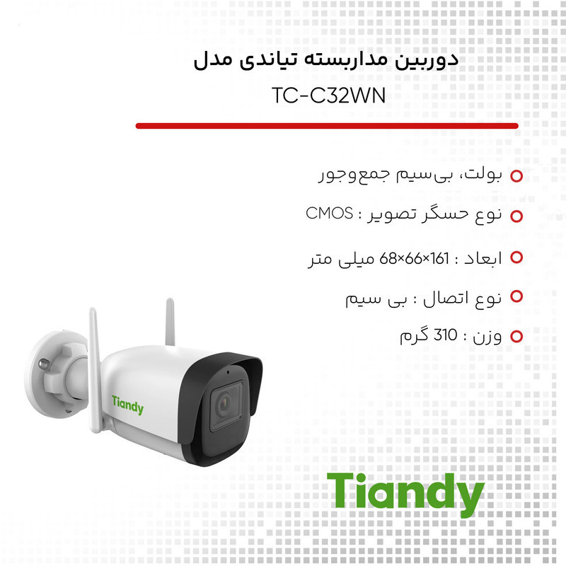 مدل TC-C32WN تیاندی با بدنهی کاملاً فلزی ارائه میشود. این دوربین دارای حداکثر رزولوشن 1920×1080 در 30 فریم در ثانیه و فشردهسازی تصاویر با استفاده از استانداردهای S+265/H.265/H.264 است. همچنین دارای مادون قرمز هوشمند با دامنهی 50 متر برای دید در شب و پشتیبانی از سه سیم و فضا میباشد. این دوربین از استانداردهای POE و IP67 نیز پشتیبانی میکند و از کدینگ هوشمند، تصویر، و زنگ هشدار بهره میبرد.