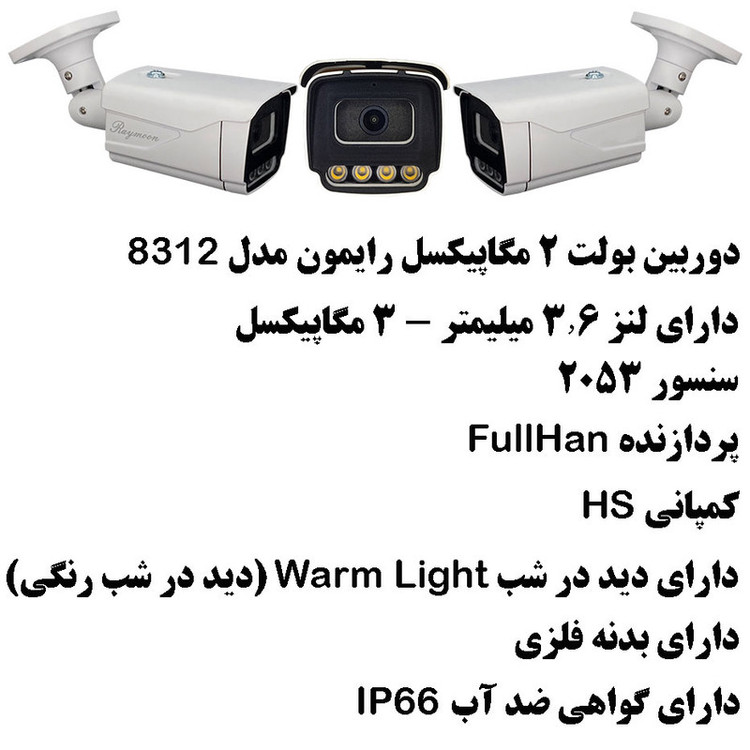 انتخاب یک شرکت معتبر و با کیفیت مهم ترین نکته ای میباشد که باید بهش توجه داشته باشین. همانطور که میدانید در هر زمینه ای شرکت های متفاوتی وجود دارد. انتخاب شرکتی که هم محصولاتش کیفیت بالایی داشته باشد هم قیمت مناسبی داشته باشد حتی برای افراد متخصص در این زمینه نیز بسیار مشکل میباشد.ما به شما محصولات شرکت رایمون را پیشنهاد میکنیم. شرکت رایمون یکی از بهترین و معتبرترین نامها در زمینه دوربین مدار بسته و تجهیزات امنیتی می باشد.این شرکت سال ها به صورت تخصصی به تولید لوازم امنیتی با کیفیت پرداخته است که علاوه بر کیفیت بالا قیمت های مناسبی نیز دارند همین امر شرکت رایمون را به یکی از بهترین و محبوب ترین شرکت ها در زمینه تجهیزات امنیتی تبدیل کرده. دوربین رایمون مدل RB-8312-2M-AHD با طراحی زیبا و جذاب از جدید ترین محصولات شرکت رایمون می باشد. بدنه این دوربین از فلز مقاوم ساخته شده است اما در عین حال وزن سبکی دارد. این دوربین رایمون دارای استاندارد IP66 می باشد که به این معنا میباشد که در مقابل نفوذ آب، گرد و خاک مقاوم بوده که به شما این امکان را میدهد که در فضاهای بیرونی بدون هیچگونه نگرانی از آن استفاده کنید. دوربین مجهز به پردازنده فول هان (Full Han) و برد 2053 از کمپانی HS میباشد که با بهره گیری از سنسور تصویر2MP ، دارا بودن لنز3MP و فاصله کانونی 3.6mm تصویری شفاف و با کیفیت (2MP) را به شما نشان خواهد داد که البته در شب و تاریکی مطلق نیز این دوربین با استفاده از تکنولوژی وارم لایت (Warm Light) تصویر تاریک شب را برای شما رنگی و شفاف نمایان میکند.