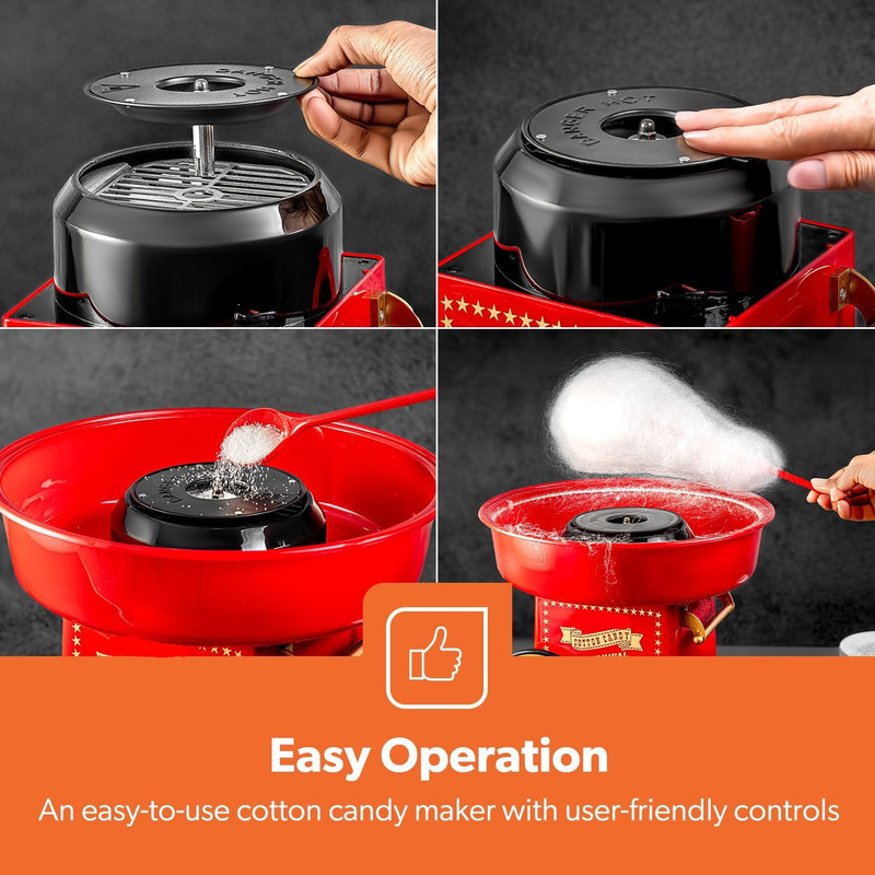 فرآیند تولید پشمک بسیار آسان بوده و با این دستگاه میتوانید با یک قاشق شکر معمولی ساخت پشمک های بزرگ مشابه آنچه در بیرون میخریدند را واقعا تجربه کنید.