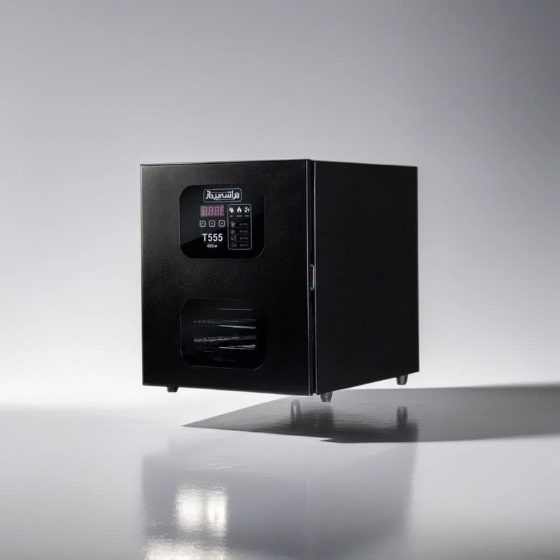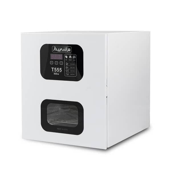 میوه خشک کن نیمه صنعتی تراشه پرداز ، دارای پروانه تایید از اتاق صنعت و معدن استان ، دارای توان مصرفی بهینه شده (400W) و فن AC ، سیستم ارتباط Direct WiFi و گواهی TUV از کشور آلمان.قابل استفاده برای مصارف خانگی و نیمه صنعتی ، کیفیت ساخت فوق العاده.شرکت ایمن تراشه پرداز از آخرین ورژن تولید خود تحت عنوان میوه و سبزی خشک کن تراشه پرداز مدل توربو T555 رونمایی کرد.نور داخل دستگاه علاوه بر زیبایی باعث میشود که کنترل بهتری نسبت به خشک کردن میوه و سبزی داشته باشید و همچنین این دستگاه با استفاده از تکنولوژی تابش حرارت و گرما به صورت موازی میوه ها را در تمام طبقات به صورت یکنواخت خشک میکند و همچنین دارای سیگنال هوشمند روتیت قفسه ها میباشد.از دیگر قابلیت های منحصربفرد این دستگاه مجهز بودن آن به سنسور رطوبت میباشد بدین شکل که امکان تنظیم آن هم به صورت دما و زمان هم به صورت رطوبت میوه وجود دارد.دستگاه میوه و سبزی خشک کن تراشه پرداز مدل توربو T555 دارای 10 عدد سینی توری آبکاری شده و 2 عدد کفی ضد زنگ و قابل شستشو میباشد. بدنه دستگاه فلزی و رنگ آن کورهای و همچنین پایه های آن ضد لغزش میباشد.