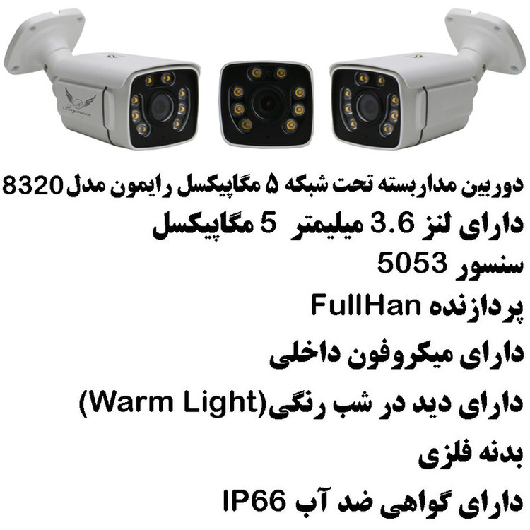 دوربین مداربسته IP پنج مگاپیکسل رایمون مدل 8320 مدل POE ، یکی از معروف ترین محصولات شرکت رایمون میباشد. این محصول دارای دید در شب رنگی ( Warm light ) میباشد. تکنولوژی Warm light به شما این امکان را میدهد که در شب شما تصاویر محیط اطرافتان را همانند روز به صورت رنگی و واضح تماشا کنید. در نتیجه شما در طول 24 ساعت شبانه روز میتوانید تصاویر محیط اطرافتان را به صورت رنگی ، واضح و با کیفیت مشاهده کنید. ویژگی بعدی این دوربین شگفت انگیز میکروفون داخلی محصول میباشد. درون این دوربین یک عدد میکروفون داخلی وجود دارد و به شما کمک میکند صدای محیط اطرافتان را بشنوید. بدنه این دوربین از فلز با کیفیت ساخته شده ولی نسبت به سایر دوربین های فلزی مشابه وزن بسیار سبک و مناسبی دارد. این دوربین دارای گواهی ضد آب (IP66) میباشد و شما میتوانید بدون هیچ ترسی دوربین را در فضاهای باز و بارانی نصب و استفاده کنید. با توجه به ویژگی های گفته شده این دوربین گزینه مناسبی برای افزایش ایمنی برای باغ ، ویلا ، فضاهای باز ، مناطق بارانی ، کارگاه ها و ...... میباشد. این دوربین پنج مگاپیکسل میباشد و تصاویر محیط و اطرافتان را با کیفیت بالا برای شما به نمایش میگذارد. این دوربین به علت اینکه از تکنولوژی POE بهره میبرد برای استفاده از دوربین دیگر نیازی به کابل کشی برق ندارید و باید از کابل و سوکت شبکه به طور همزمان برای انتقال صدا و تصویر و برق دوربین استفاده کنید و حتما از سوئیچ شبکه POE استفاده کنید و گرنه به دوربین آسیب وارد میکنید. دوربین های POE به سیم برق نیاز ندارن و برق مورد نیاز خود را از کابل شبکه LAN تامبن میکنند. و دیگر نیازی ندارید هزینه ای بابت سیمکشی برق دوربین پرداخت کنید. این دوربین دارای لنز 3.6 میلیمتر 5 مگاپیکسل میباشد. زاویه دید دوربین 78 درجه میباشد.