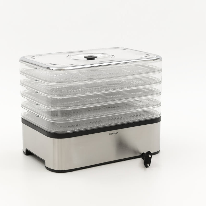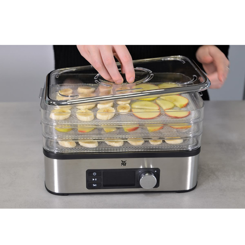 تنقلات سالم و میوه های را خودتان درست کنید و آنها را با خود ببرید . میوه خشک شده ، قارچ خشک شده ، گیاهان ، چیپس سبزیجات ، گوشت گاو یا میسلی را می توانید با مبلغ زیاد در سوپر مارکت خریداری کنید یا می توانید خودتان آنها را به راحتی تهیه کنید . دهیدراتور اتوماتیک با صرفه جویی در فضا و انرژی ، همه چیزهایی را که می توانید روی شبکه یا در قالب سیلیکونی اضافی قرار دهید خشک کرده و خشک می کند . میان وعده های خوشمزه و میله های گرانولو تقریباً بی صدا در پنج طبقه تولید می شوند . محافظت در برابر گرمای بیش از حد با خاموش شدن خودکار باعث ایجاد ایمنی لازم می شود . صبح روز بعد ، به سادگی غذاهای کوچک را برای کار بریزید یا به عنوان یک میان وعده به کودکان بدهید . همچنین یک مجموعه عملی با دو جعبه ذخیره و یک جعبه نوار غلات اضافی نیز وجود دارد .