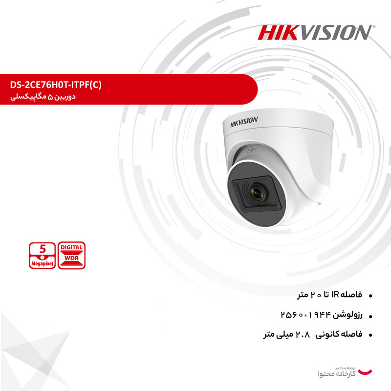 دوربینهای مداربسته به یکی از لوازم پرمصرف در ستختمانها، ادارات، کارخانهجات، فروشگاهها و سایر صنوف تبدیل شدهاند. با استفاده از این دوربینها میزان سرقت تا حدودی کاهش پیدا کرده است. دوربینهای مدار بسته انواع مختلفی دارند. یکی از مدلهای پر طرفدار این دوربینهای نظارتی، دوربینهای دام هستند. هایک ویژن یکی از شرکتهای پیشگام در تولید انواع دوربینهای امنیتی و نظارتی است. یکی از محصولات با کیفیت این برند مدل DS-2CE76H0T-ITPF است. این مدل با یک لنز 5 مگاپیکسلی از نوع CMOS قابلیت انتشار تصاویری با حداکثر رزولوشن 2560x1944 پیکسل است. این دوربین از نوع آنالوگ بوده و توسط کابل متصل می شود. این مدل قابلیت دید در شب تا فاصله 20 متری را دارد اما باید به این نکته توجه داشت که تصاویر ذخیره شده در شب توسط این مدل به صورت رنگی نیستند.