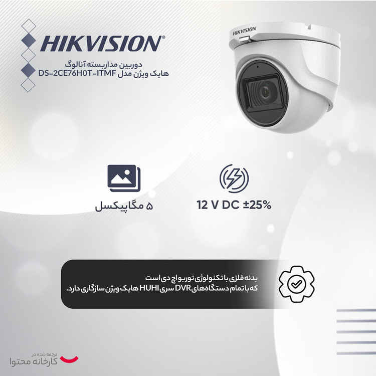 دوربین مداربسته هایک ویژن DS-2CE76H0T-ITMF یک دوربین مداربسته 5 مگاپیکسل بدنه فلزی با تکنولوژی توربو اچ دی است که با تمام دستگاههای DVR سری HUHI هایک ویژن سازگاری دارد.