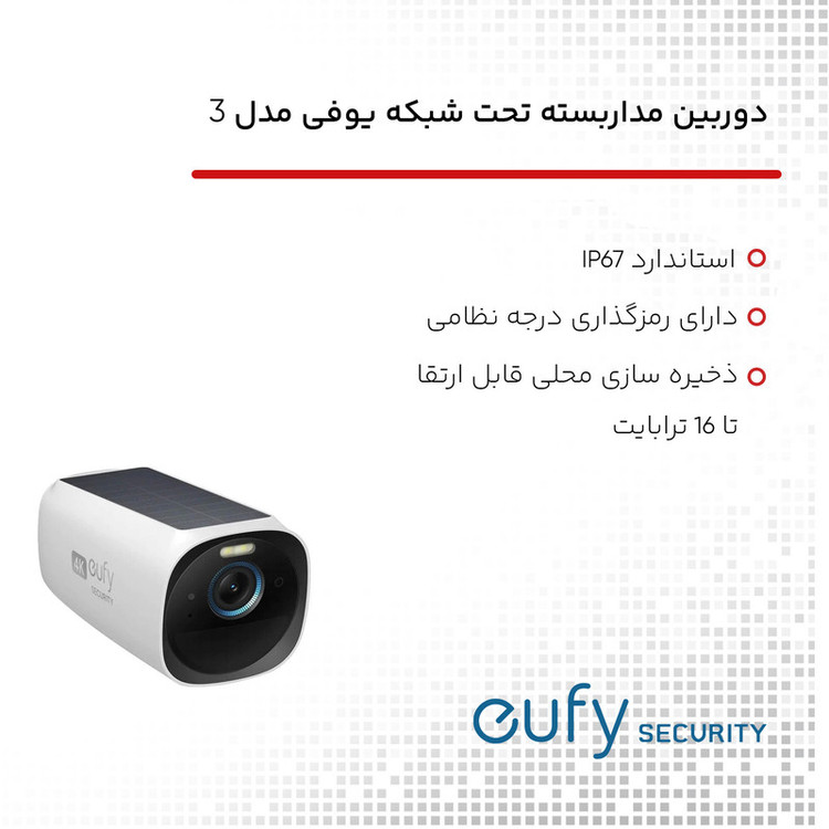eufycam 3 دارای رمزگذاری درجه نظامی برای ذخیره سازی محلی قابل ارتقا تا 16 ترابایت است که از ذخیره سازی امن داده ها بدون نیاز به سرویس های ابری مبتنی بر اشتراک اطمینان حاصل می کند.