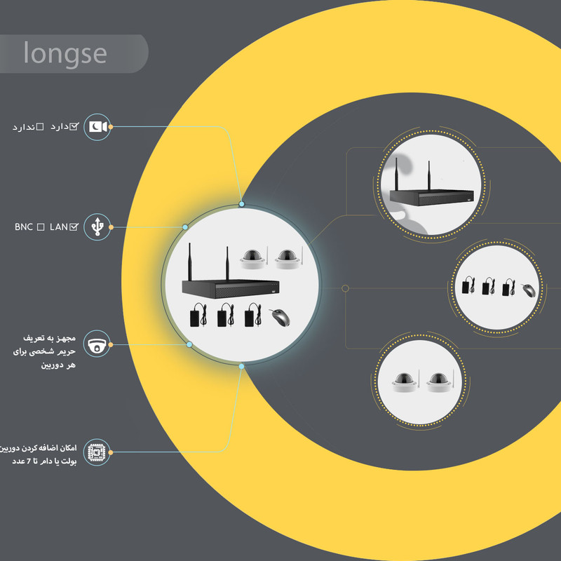 تعریف حریم شخصی برای هر دوربین، انتقال تصویر P2P، بدنه فلزی دوربین ها، امکان اضافه کردن دوربین شبکه بولت یا دام تا 7 عدد