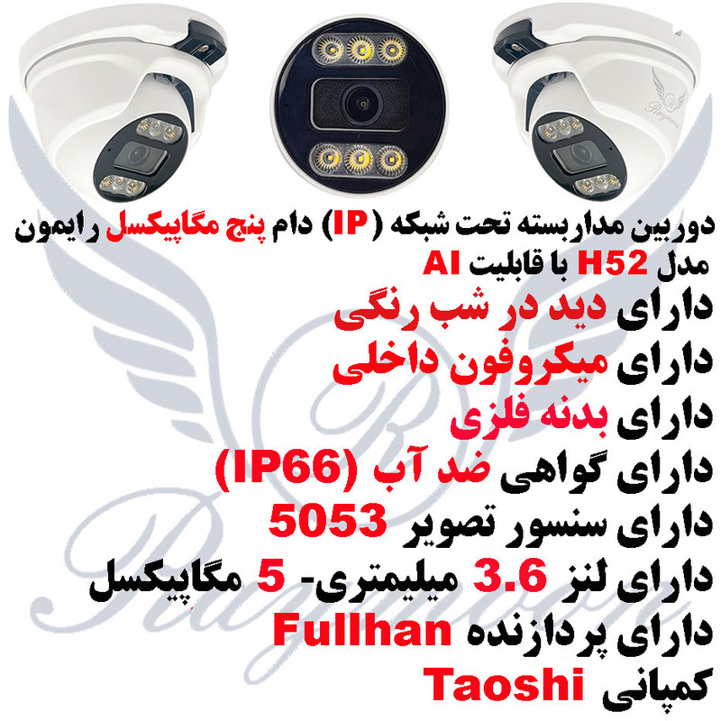 دوربین مداربسته تحت شبکه رایمون با رزولوشن واقعی 5 مگاپیکسل، یکی از پیشرفته ترین محصولات نظارتی روز دنیا محسوب میشود که با بهره گیری از فناوری های نوین در زمینه ی تصویر، امنیت و دوام، گزینه ای ایده آل برای فضاهای مسکونی، اداری، تجاری و صنعتی است. پشتیبانی از پروتکل های استاندارد ONVIF موجب میشود که این دوربین با اکثر دستگاه های NVR موجود در بازار سازگار باشد.این دوربین دارای تکنولوژی هوش مصنوعی میباشد و امکانات زیادی مثل تشخیص حرکت ، شمارش افراد و ....به شما میدهد اما توجه داشته باشید برای استفاده از قابلیت های هوش مصنوعی باید از NVR های رایمون که از تکنولوژی هوش مصنوعی یا NVR هایی که نرم افزار انتقال تصویرشان برنامه XMEYE PLUS هست و از تکنولوژی هوش مصنوعی پشتیبانی میکنن استفاده کنید تا بتوانید از قابلیت های هوش مصنوعی دوربین استفاده کنید. دوربین دارای سنسور تصویر 5053 و پردازنده :FullHan میباشد. این سنسور با عملکرد عالی در شرایط نوری مختلف، تصویری واضح و بدون نویز ثبت میکند. دوربین دارای لنز ثابت 3.6mm و زاویه دید 78 درجه میباشد که برای پوشش کامل محیط های متوسط مانند فروشگاه ها، دفاتر، پارکینگ ها و حیاط منازل بسیار مناسب است. این ترکیب، تعادل بینظیری بین جزئیات تصویر و گستردگی دید به وجود میاورد. یکی از ویژگی های برجسته دوربین پنج مگاپیکسل رایمون، دید در شب رنگی واقعی آن است. برخلاف بسیاری از دوربین ها که در تاریکی به تصویر سیاه و سفید محدود میشوند، این مدل با بهره گیری از فناوری LED های هوشمند و سنسور حساس به نور، در شب نیز تصاویری رنگی و با کیفیت بالا ثبت میکند. این قابلیت، امنیت و دقت تشخیص افراد و اشیا را به طور چشمگیری افزایش میدهد. دوربین مجهز به میکروفون داخلی با کیفیت بالا است که صدای محیط را به صورت همزمان با تصویر ضبط میکند. این ویژگی برای بررسی دقیق وقایع، گفتگوها یا شناسایی صداهای غیرعادی بسیار مفید است و به شما امکان میدهد نظارتی جامع تر بر محیط داشته باشید. بدنه دوربین از آلیاژ فلزی مستحکم ساخته شده که علاوه بر زیبایی ظاهری، مقاومت فوق العاده ای در برابر ضربه، گردوغبار و شرایط آب و هوایی مختلف دارد. دوربین دارای گواهی بین المللی IP66 است که نشان دهنده ی مقاومت کامل آن در برابر باران، برف، رطوبت و ذرات گرد و غبار میباشد.