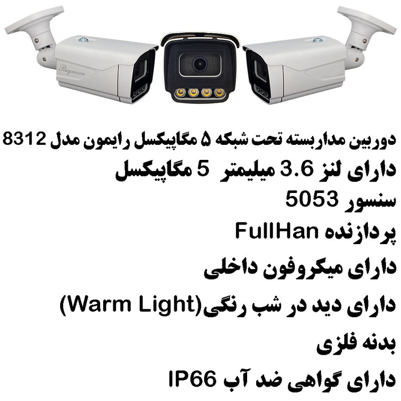 شرکت رایمون یکی از بهترین تولیدکنندگان محصولات امنیتی مثل انواع دوربین های مداربسته ، ضبط کننده ویدئویی (DVR/NVR) در ایران میباشد. کیفیت فوق العاده ، قیمت مناسب و پشتیبانی واقعی از محصولات تولید شده دلیل محبوبیت برند رایمون میباشد. دوربین مداربسته تحت شبکه 5 مگاپیکسل رایمون مدل POE کد 8312 از جدیدترین محصولات این شرکت میباشد که دارای دید در شب رنگی (WARM LIGHT) واضح و با کیفیت تا 15 متر مربع ، بدنه مقاوم و فلزی ، گواهی ضد آب IP66 و دارای میکروفون داخلی میباشند که این دلایل دوربین را به یک محصول مطمئن و محبوب تبدیل کرده است. با توجه به نکات گفته شده این دوربین گزینه مناسبی برای فضا های باز و بارانی میباشد. با استفاده از این دوربین و با هزینه ای معقول شما امنیتتان را افزایش میدهید و با آرامش خاطر محل مسکونی خودتان را ترک میکنید. برای استفاده از دوربین POE باید حتما از سوئیچ شبکه POE استفاده کنید و گرنه به دوربین آسیب وارد میکنید. دوربین های POE به سیم برق نیاز ندارن و برق مورد نیاز خود را از کابل شبکه LAN تامبن میکنند. این دوربین دارای لنز 3.6 میلیمتر 5 مگاپیکسل میباشد. زاویه دید دوربین 78 درجه میباشد.