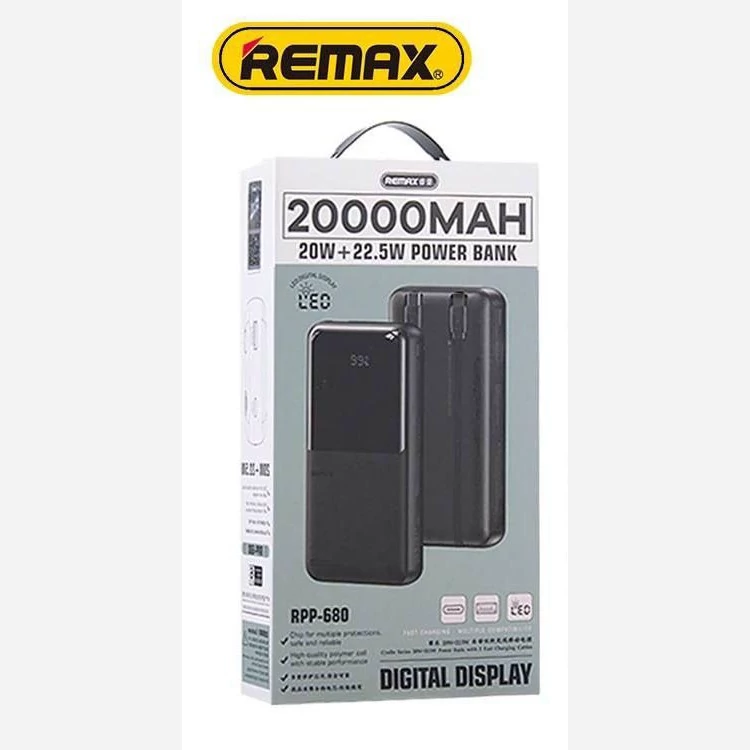 پاوربانک اصلی ریمکس 20 هزار میلی آمپر مدل RPP-680 فست شارژ دارای کابل سر خود