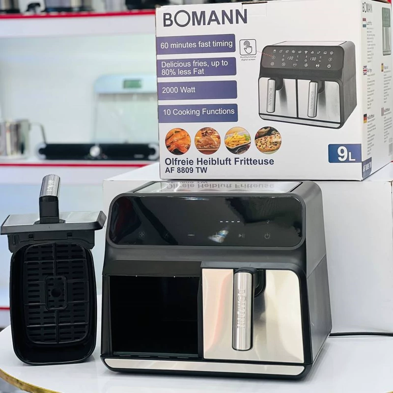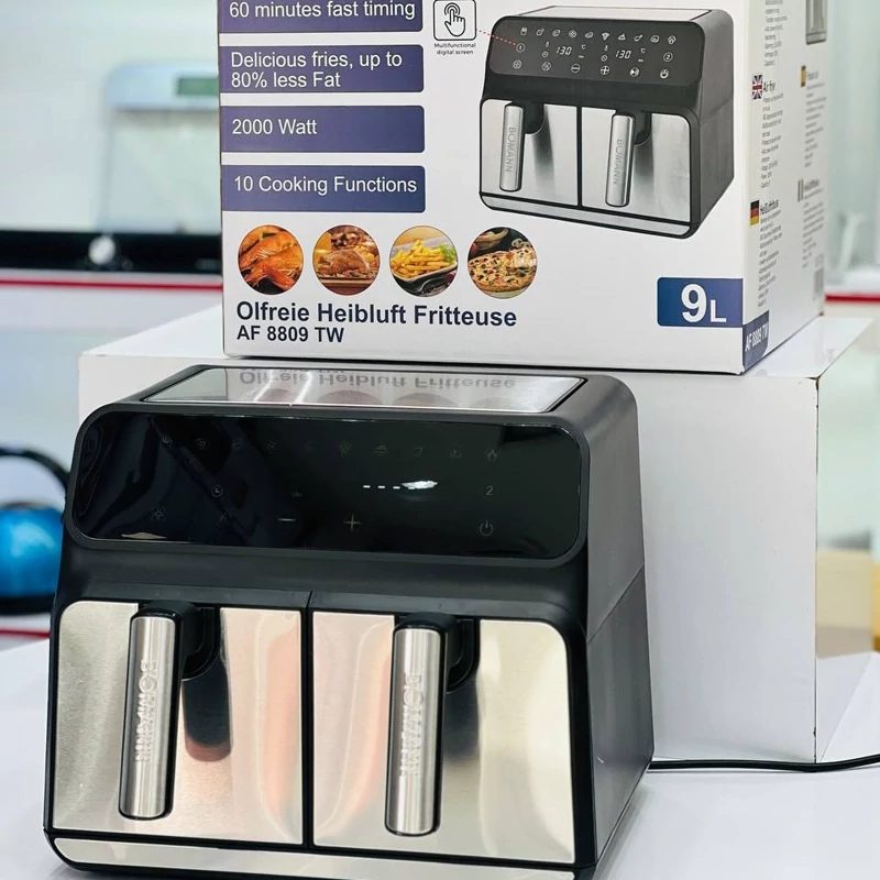 سرخکن دوقلو رژیمی بومن مدل AF8809 ظرفیت 9 لیتر تایمر 1 ساعته تنظیم دما از 80 تا 200 درجه آلارم اتمام تایم پخت نمایشگر