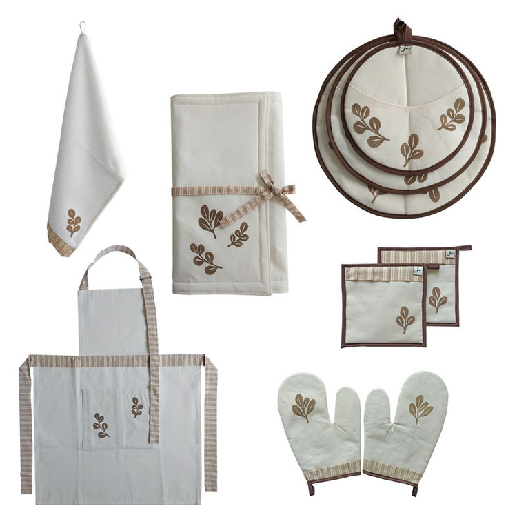 شامل: یک پیشبند، یک آبگیر کنار سینک، یک جفت دستکش فر، یک جفت دستگیره، یک حوله، ی، سه عدد دمکنی قطر دمکنی ها: 23، 27، 33 ابعاد نمگیر: 80 در 50 ابعاد حوله: 40 در 35